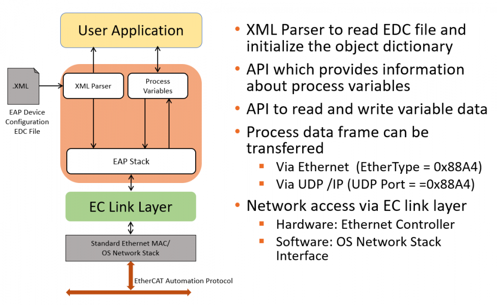 The EC-EAP Stack requires just a conventional Ethernet interface for the communication. In conjunction with the high performance EC-Master Link Layers, a lot of variables could be transferred at a low system load.