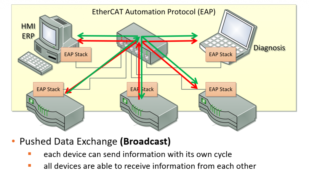 The cyclic data exchange is based on the “pushed” or “polled” principle. In “pushed” mode, each communication device (publisher) sends its data cyclically or in a multiple of its own cycle. The receiver (subscriber) can be configured to specify which data should be received from which sender. As usual with EtherCAT, the sender and recipient data are configured via an object directory and process data mapping.