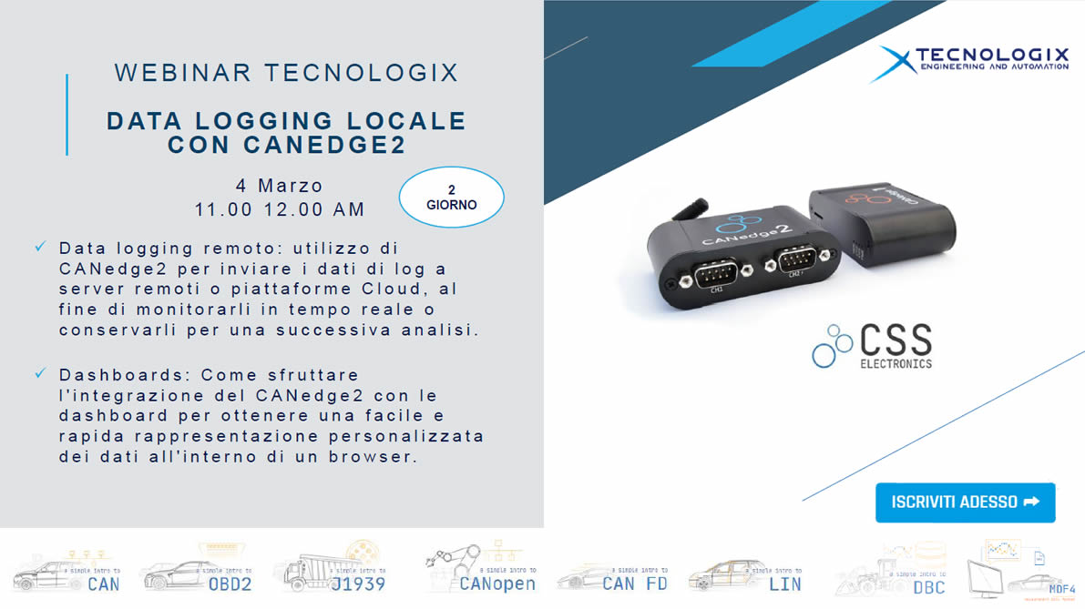 Tecnologix propone un webinar per presentare il dispositivo CANedge2 di CSS Electronics, un CAN/LIN Bus data logger con funzionalità di memorizzazione: