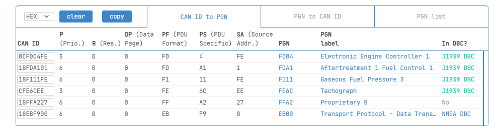 If you have a list of CAN IDs from a J1939-based vehicle, you can paste them in our 'CAN ID to J1939 PGN converter':