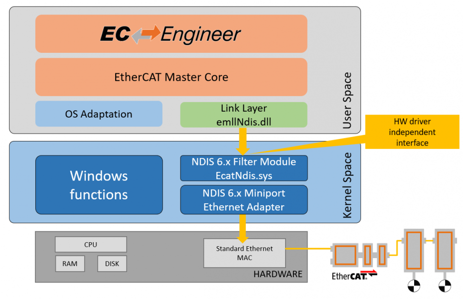 The Network Driver Interface Specification (NDIS) is the specification for a network driver architecture that allows transport protocols like TCP/IP to communicate with an underlying physical network adapter. For sending and receiving EtherCAT frames in Windows, EC-Master includes a NDIS Link Layer (emllNdis.dll) to make use of any Windows network interface.
