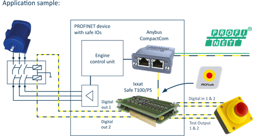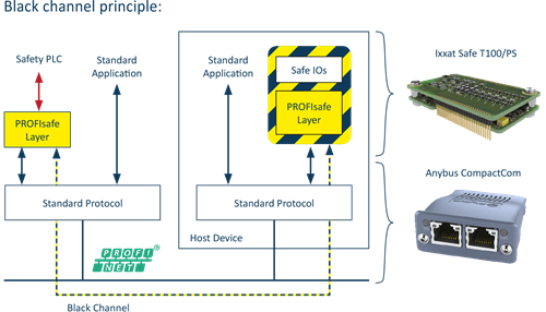 The Ixxat Safe T100/PS is used in customer devices together with a communication module of the Anybus CompactCom series, which is used to implement the unsafe bus connection. Safety communications use the black channel principle through the Anybus CompactCom communication module. For PROFIsafe, the communication module carries out the tasks of a PROFINET I/O device.