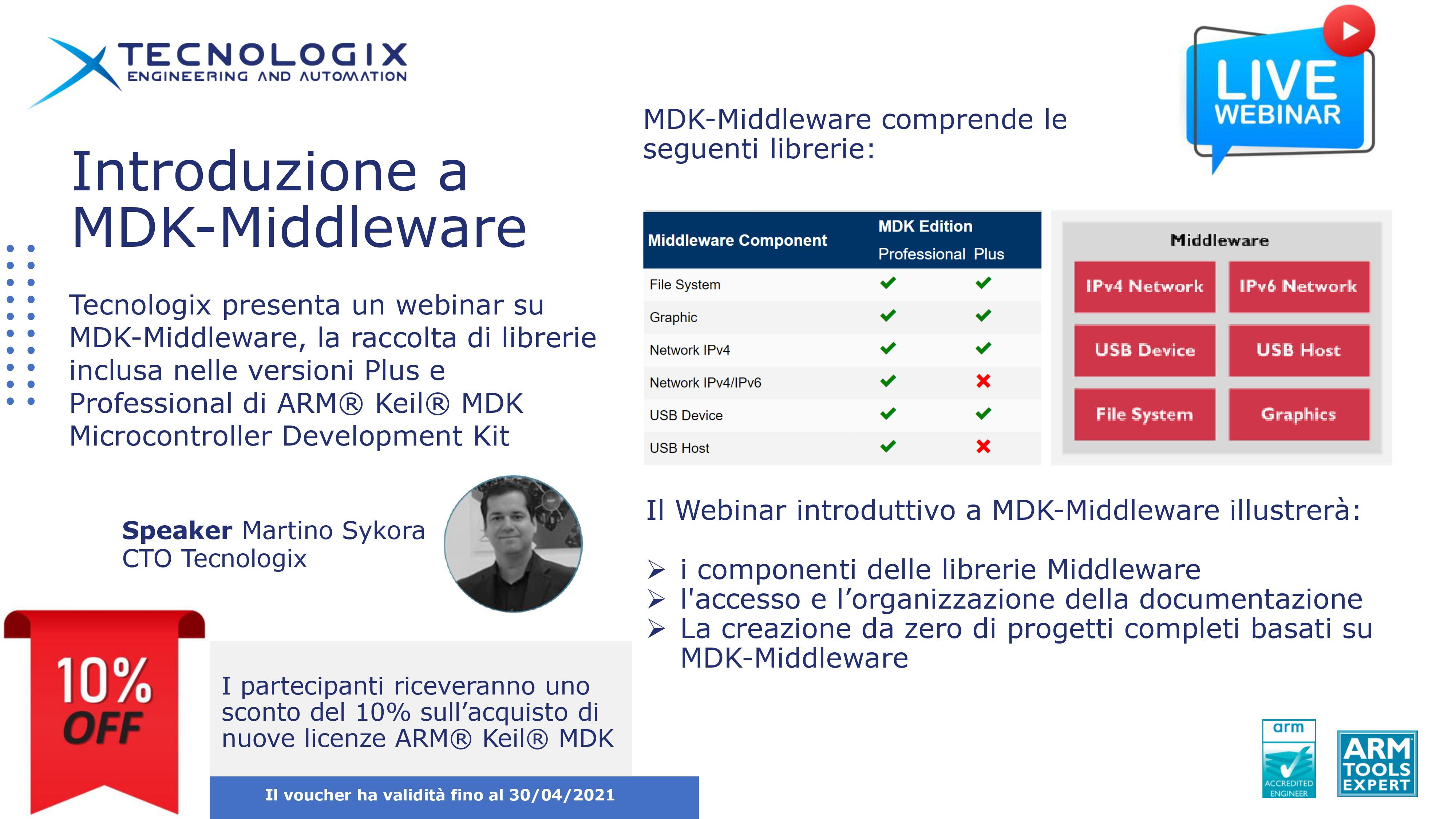 ARM® Keil® MDK è la piattaforma software di riferimento per lo sviluppo di soluzioni basate su microcontrollori ARM Cortex®. Per dispositivi basati su architettura Cortex-M, la nuova versione MDK-Plus dispone di un middleware completo per applicazioni che necessitano di gestire File System, Grafica, connettività TCP/IP o dispositivi USB.