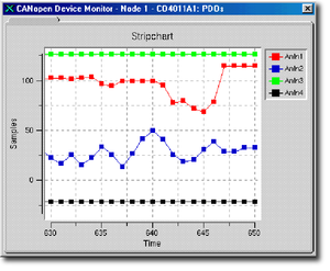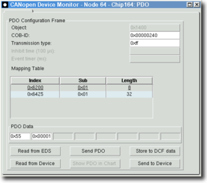 The PDO tab allows the simple configuration of the PDO-Mapping by Drag&Drop. Additionally PDOs can be sent and received and data from received PDOs can be plotted in a stripchart with one click.