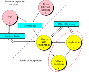The EtherCAT Library consists of a hardware independent and a hardware dependent part that communicate with message queues. The hardware dependent part consists of controlling software for the EtherCAT driver and timer functions.