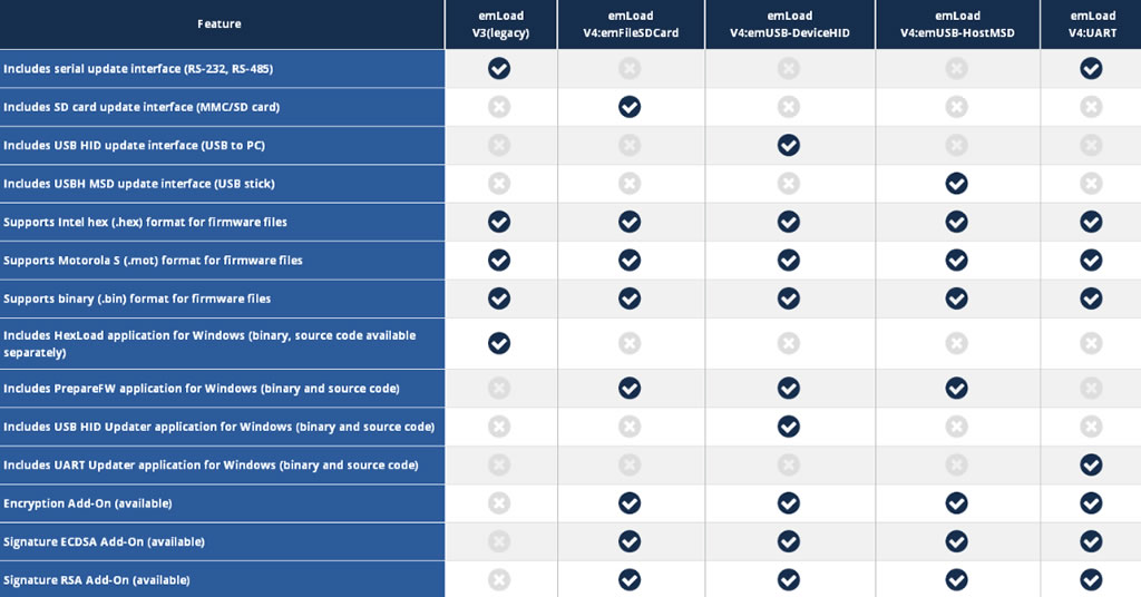 The bootloader emLoad is available with different interface modules. emLoad allows straight-forward firmware updates of embedded applications, either with a USB stick, an SD card, via USB-connection to a PC, or a serial connection (type RS-232, RS-485). In addition it can be used with an application that retrieves the update and stores it in a place where the update process of the bootloader can easily access it.