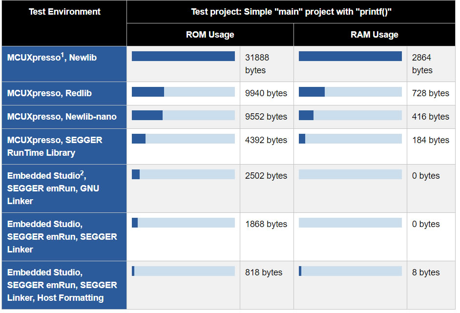 SEGGER did some benchmarking on emRun using NXP’s MCUXpresso as a representative IDE that might benefit from using emRun. The benchmark consists of a simple "printf()" with output to a debug terminal. We compared the results for emRun with the results for three other C libraries (Newlib, Newlib-nano, and Redlib). In each case, printf() was configured for the smallest possible size (size-optimized libraries, no floating point...). We then also tested with our own IDE, Embedded Studio, with the same code, using emRun, in one case using the GNU Linker, in another case using the SEGGER Linker.