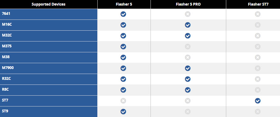 | Flasher 5Flasher 5 is a programming tool for ST9 and Renesas M16C/20, M16C/62, M16C/80, M32C, R8C, R32C, M38 and M79 series of flash microcontrollers in serial mode (1.5 MByte Flash to store target program, remote control functions for automated testers). MAIN FEATURES