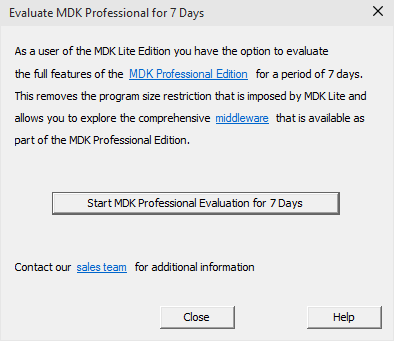 - Click on Start MDK Professional Evaluation for 7 Days.